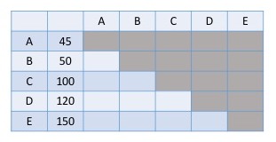 1. Anota el volumen de búsquedas de las palabras clave principales de cada URL. Por ejemplo: URL A:45 búsquedas, B:50, C:100, D:120 y E:150.