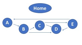 Según este ejemplo, para la KW de la URL D, las páginas relevantes son la A, C y E. Si la B no es relevante (tal vez porque no hay ninguna relación semántica), no la enlazamos. Y si la E es relevante pero está en la parte tachada porque tiene más búsquedas, entonces directamente no enlazamos.